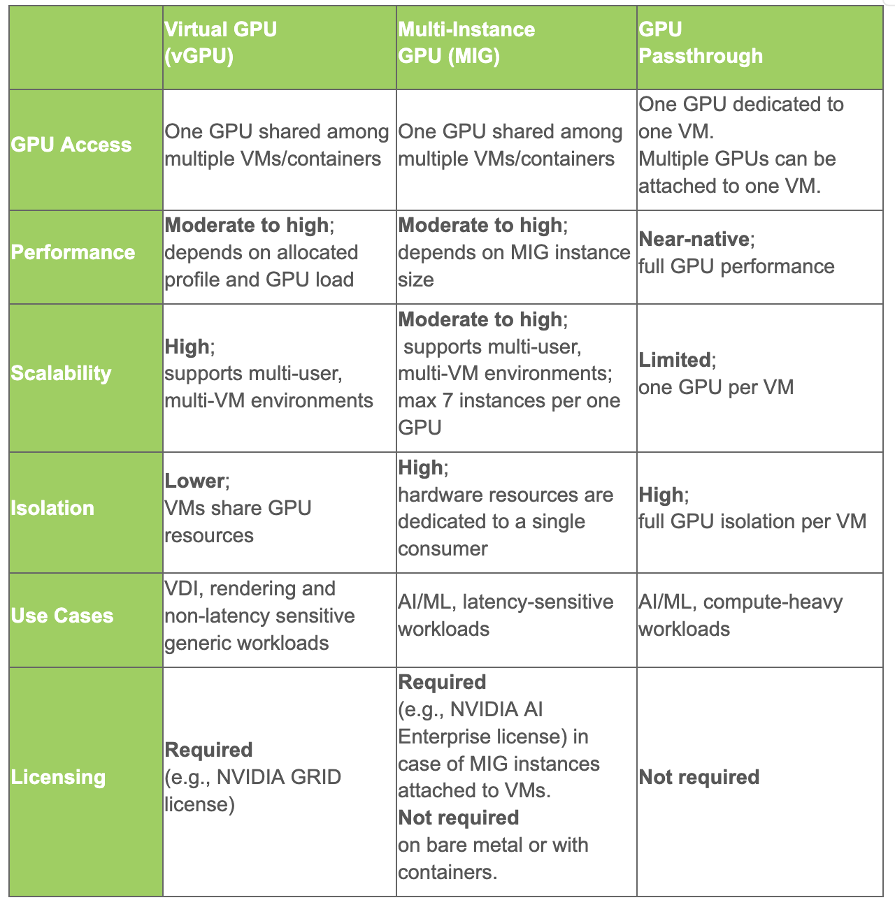 It is worth noting that MIG is supported by high-end data center and professional GPU models such as the NVIDIA A30/A100/H100/H200 and RTX Pro 6000, whereas vGPU support can be found across a broader set of NVIDIA GPU models. The number of usable MIG instances also varies by GPU model and is limited to a maximum of seven per card. That means no more than seven users can share one MIG GPU. With vGPU, the number of consumers is determined by the profiles, which divide available GPU memory into fixed chunks that can be as small as 1GB or as large as the whole VRAM available, meaning vGPU potentially allows more users to share one GPU. More on the impact of the GPU sharing with vGPU can be found in the NVIDIA documentation. The table below acts as a summary of vGPU vs MIG vs GPU passthrough approaches and their use-cases.