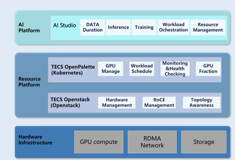 ZTE provides a full set of AI hardware equipment. Includes GPU servers, RDMA switches, and high-performance storage devices. At the software level, the solution consists of OpenStack, Kubernetes, and ML layers