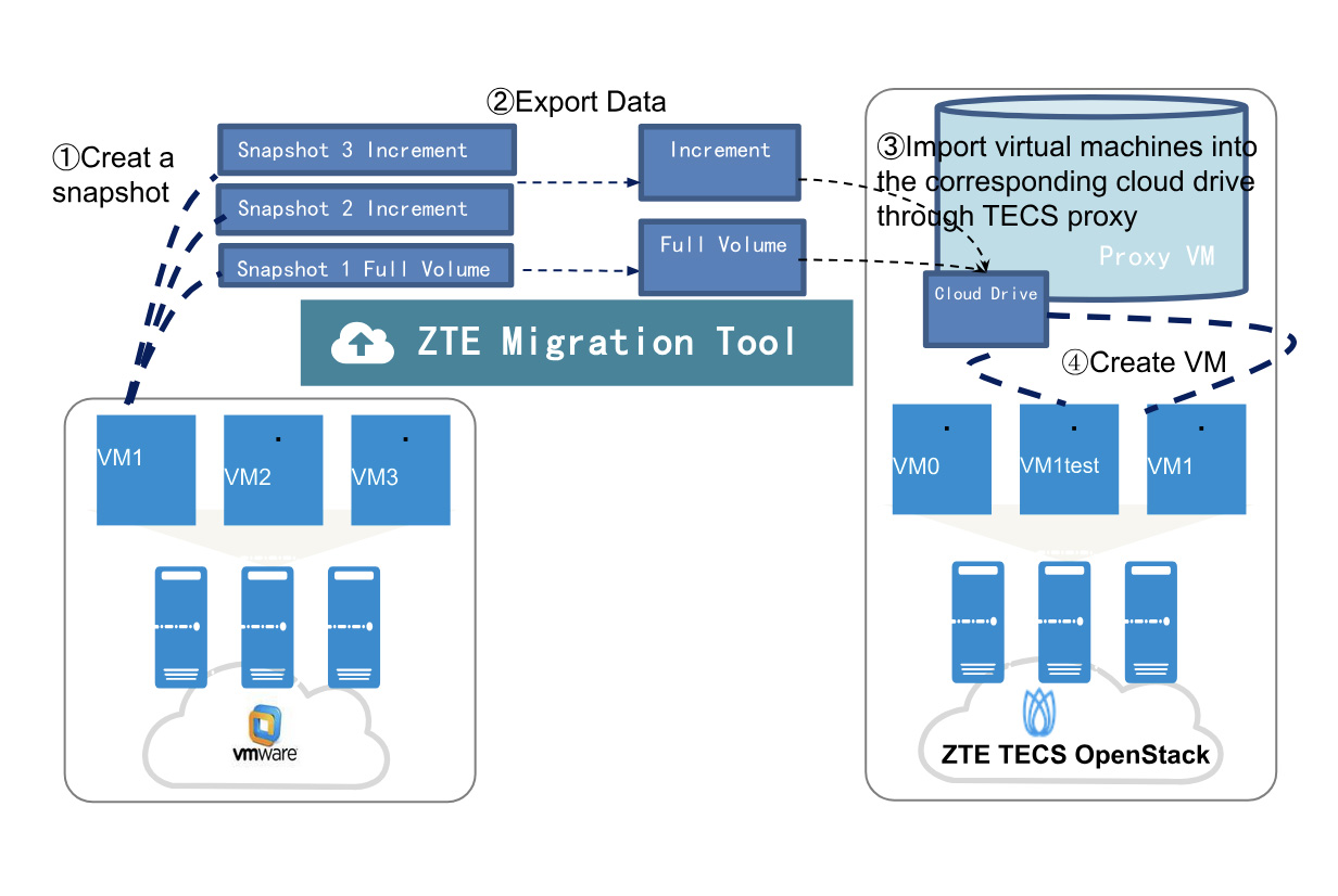 The tool automatically invokes VMware APIs to generate source VM snapshots and replicates complete data images to the target TECS cluster without affecting source operations, ensuring initial data consistency.